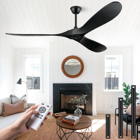 ABZ Ceiling Fans Without Lights - 60 Inch Ceiling Fan no Light, Black 3 Blade Solid Wood Indoor Outdoor Ceiling Fan with Remote Control for Patios Living Room Bedroom